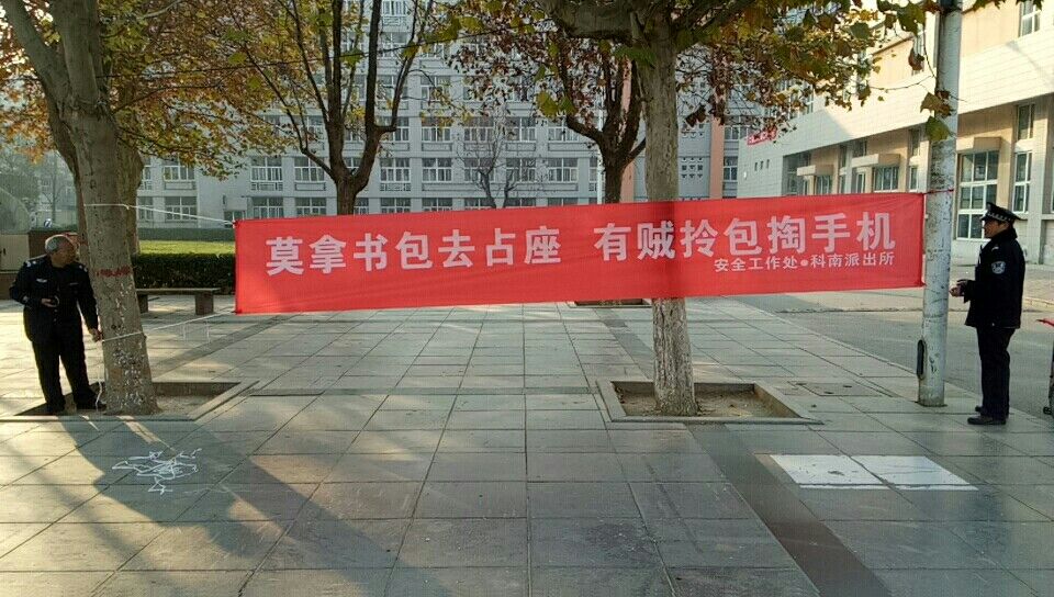 近期,安全工作处针对往年冬季校园高发掏兜、拎包等盗窃类案件,制作一批警示条幅,并悬挂于各学生饭堂、西门内外、上课路上等人流密集的地方,以此希望引起学生注意。同时积极调整各流动执勤人员的地点及执勤时间,严防盗窃类案件的发生。